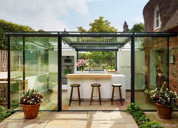 Nhờ có lớp kính trong suốt, người trong bếp sẽ có cảm giác như đang nấu ăn giữa vườn cây. Từ đây bạn có thể nhìn ngắm mọi ngóc ngách của khu vườn, tận hưởng không gian thoáng đãng thư thái hiếm có ở những căn bếp trong nhà. Căn bếp được nối với không gian bên ngoài bằng những chiếc cửa kính trượt bản rộng, dễ dàng mở rộng mỗi khi bạn muốn bước ra khu vườn. Những đồ vật làm bằng gỗ và sơn phủ màu trắng bên trong càng giúp cho căn bếp thêm hài hòa với khung cảnh vườn cây xung quanh.