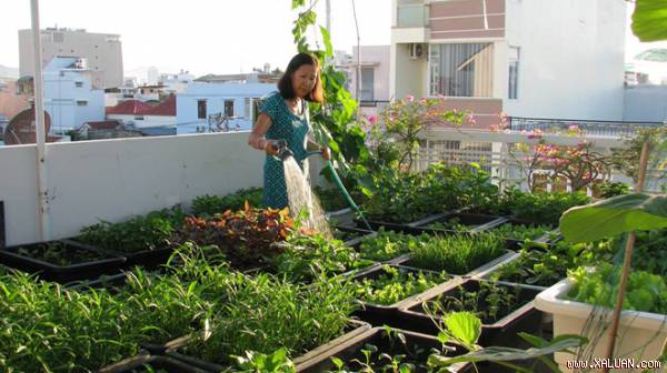 Khoảng sân tầng 3 rộng 25 m2 trồng nhiều loại rau lấy lá như mồng tơi, rau đay, dền, cải, muống, ngót; rau gia vị và các loại quả...